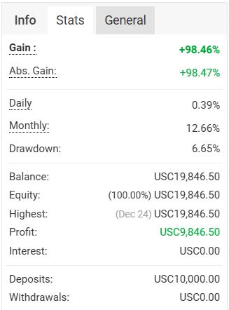 So much for a 'slow' market sentiment this week. Gold made a couple of ATH throughout the week despite the holidays and the market closing for the entire day on Christmas. ATP EA 1 is having issues with the updates from myfxbook and I am not keen to re-add it again. Once it is updated, I will change the screenshot but anyways, we have reached a big milestone for this martingale EA, a double in the account without blowing it! The drawdown was also kept reasonably low and safe at around 13.90%.